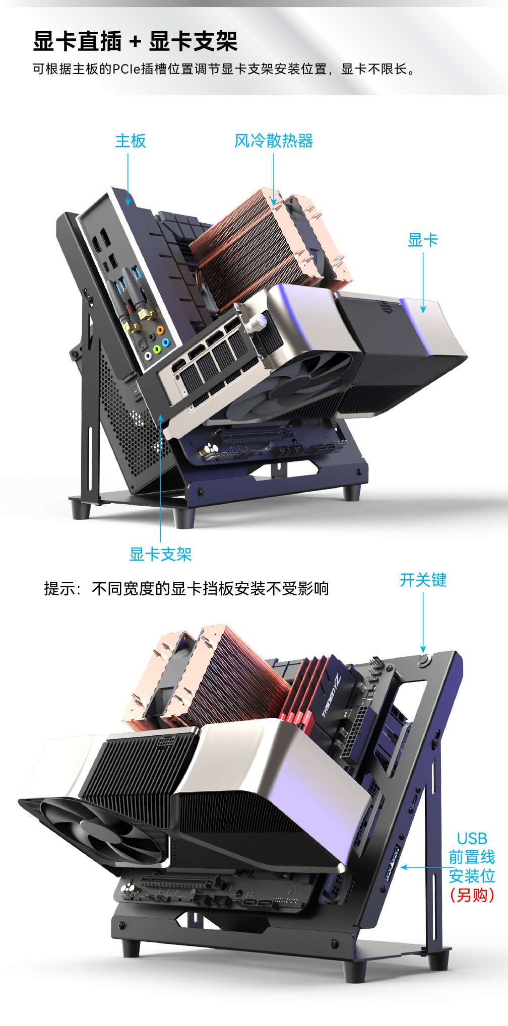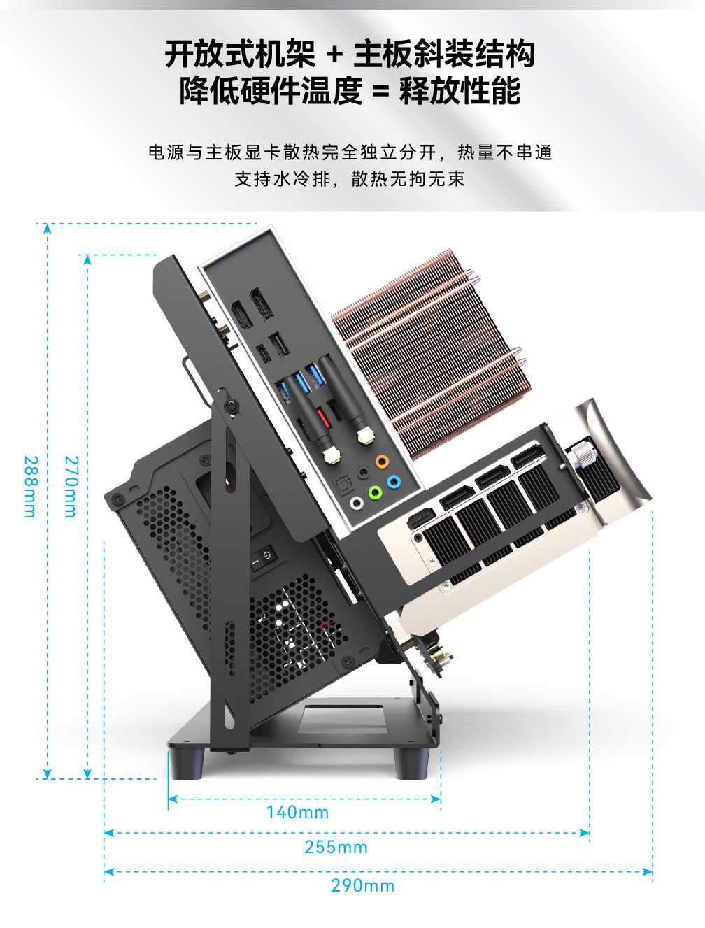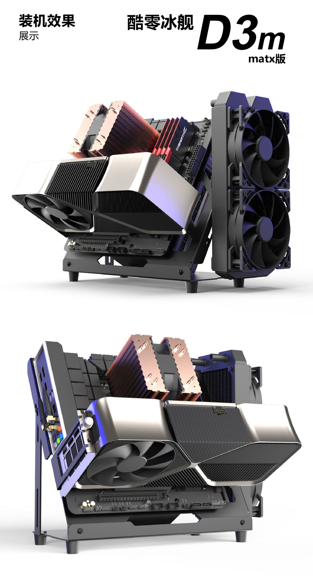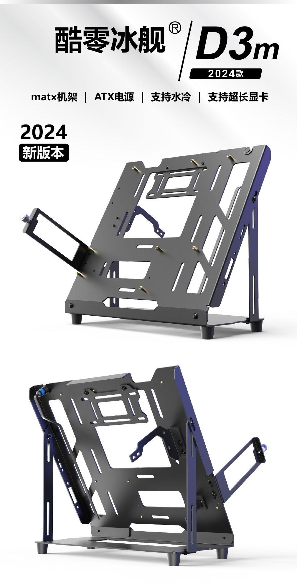 开放式电脑机架 我们对开放式的电脑机箱有执着的热情,这是能设计成功的关键,它的出现可以辅助电脑爱好者挑战电脑硬件的性能极限,因为它能提供更好的散热,更全的硬件兼容性,简易的安装就可以使用。 D3m Iceship X2i是一款开放式的电脑机箱,可自由伸缩来适配GPU的长度,并且支持360水冷的安装,是款不错的小体积itx机架。 价格 ¥: 淘宝零售价 /元 0 淘宝直通链接 结构说明 详细数据 商品介绍 安装教程 2025款D3m架构更新如下: 1.支持ATX主板,机架整体加高10mm。 2.可以安装2个显卡支架,除显卡之外,再安装1个pcie设备。 3.新增显卡挂钩,正确的安装可使显卡因重力下垂变形更小,最大程度保护显卡。 4.显卡挂钩支持高度172mm,厚度78mm以内的显卡。 5.当显卡插入主板的第2个pcie插槽时,挂钩需安装在下面的安装孔。 6.显卡挂钩支持长度大于260mm的显卡,如果显卡短于260mm,将无法使挂钩勾住显卡。 7.显卡挂钩为中空结构,显卡供电线可以隐藏在中间,并设计了扎带的捆绑孔和显卡供电线的出口。 安装视频教程2024.12.16更新