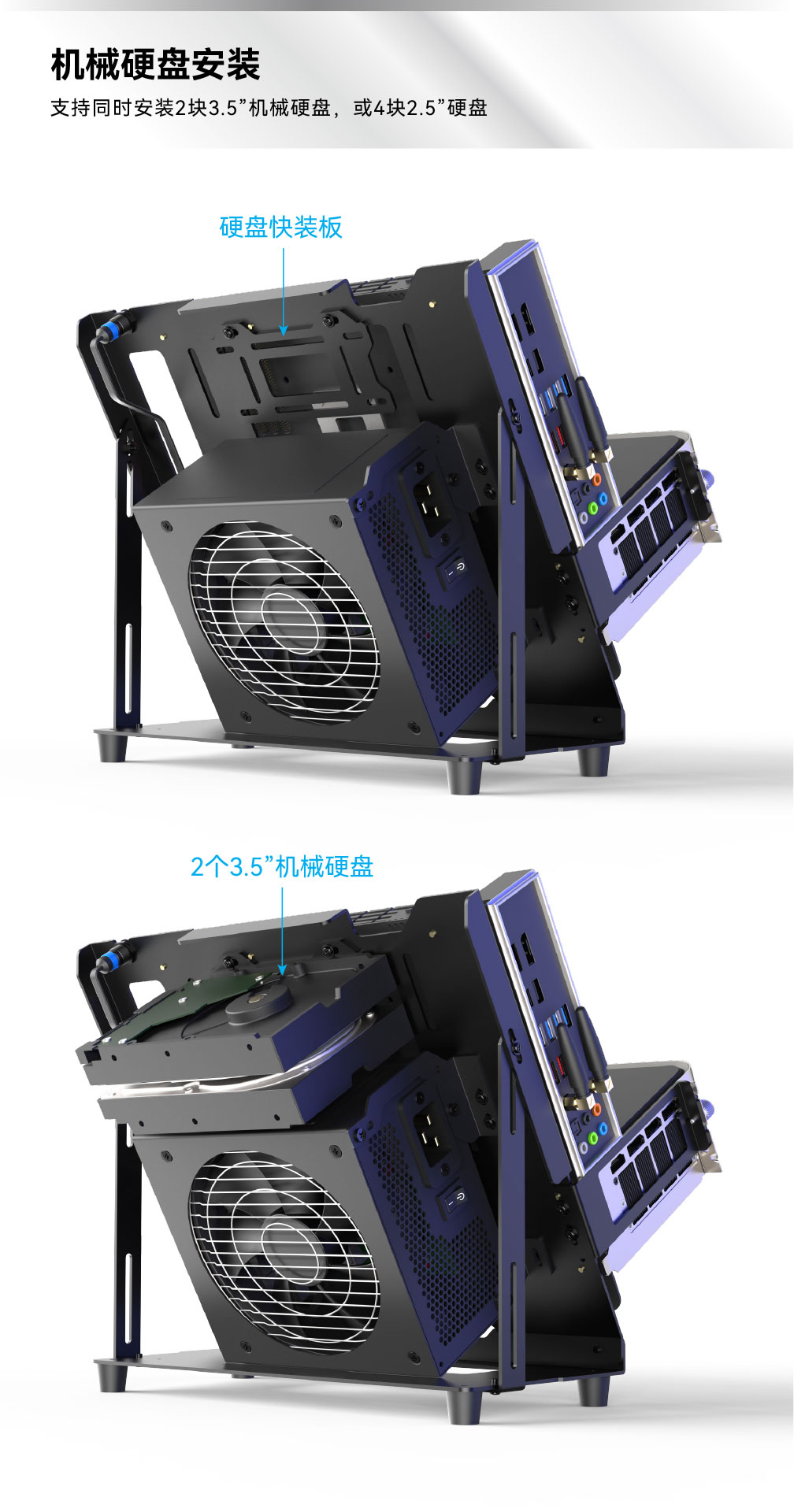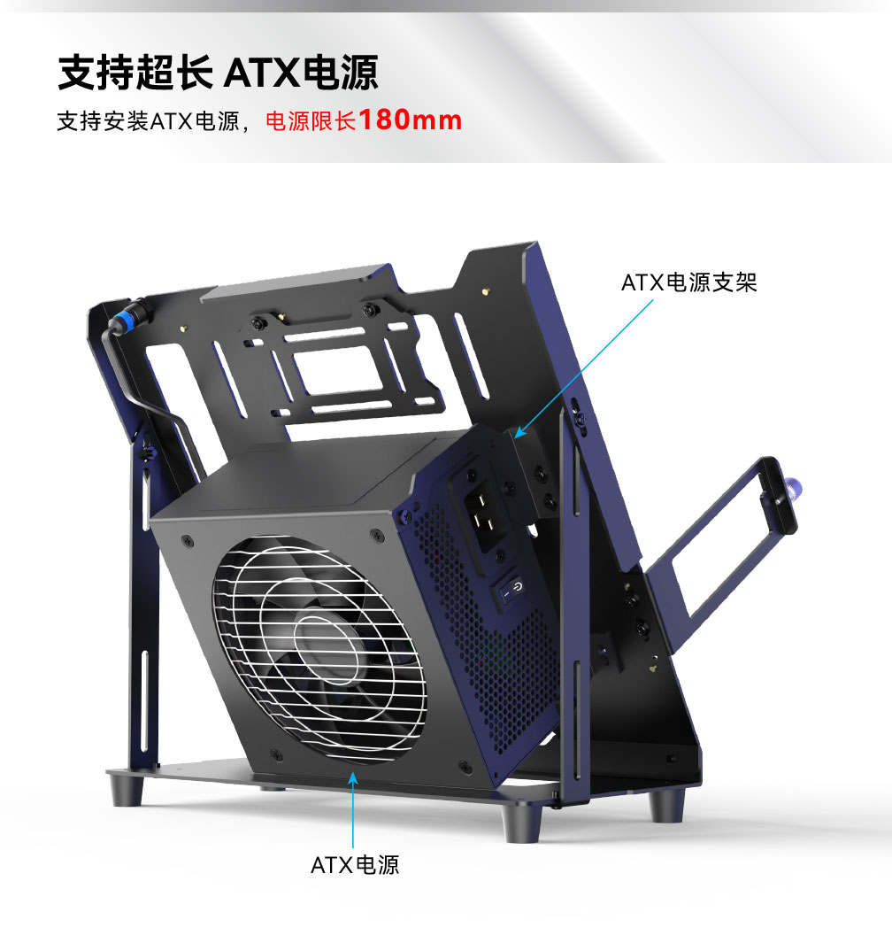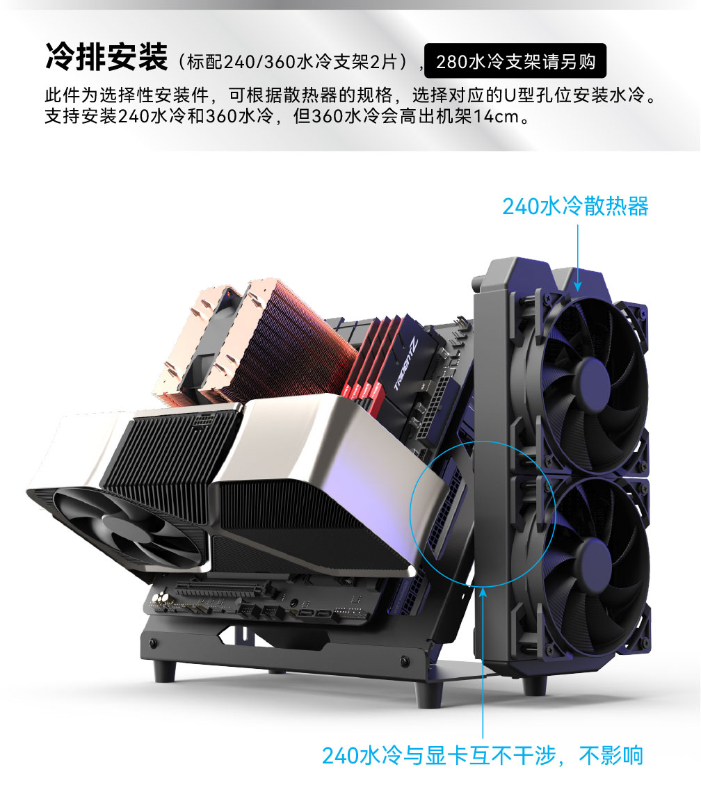 开放式电脑机架 我们对开放式的电脑机箱有执着的热情,这是能设计成功的关键,它的出现可以辅助电脑爱好者挑战电脑硬件的性能极限,因为它能提供更好的散热,更全的硬件兼容性,简易的安装就可以使用。 D3m Iceship X2i是一款开放式的电脑机箱,可自由伸缩来适配GPU的长度,并且支持360水冷的安装,是款不错的小体积itx机架。 价格 ¥: 淘宝零售价 /元 0 淘宝直通链接 结构说明 详细数据 商品介绍 安装教程 2025款D3m架构更新如下: 1.支持ATX主板,机架整体加高10mm。 2.可以安装2个显卡支架,除显卡之外,再安装1个pcie设备。 3.新增显卡挂钩,正确的安装可使显卡因重力下垂变形更小,最大程度保护显卡。 4.显卡挂钩支持高度172mm,厚度78mm以内的显卡。 5.当显卡插入主板的第2个pcie插槽时,挂钩需安装在下面的安装孔。 6.显卡挂钩支持长度大于260mm的显卡,如果显卡短于260mm,将无法使挂钩勾住显卡。 7.显卡挂钩为中空结构,显卡供电线可以隐藏在中间,并设计了扎带的捆绑孔和显卡供电线的出口。 安装视频教程2024.12.16更新