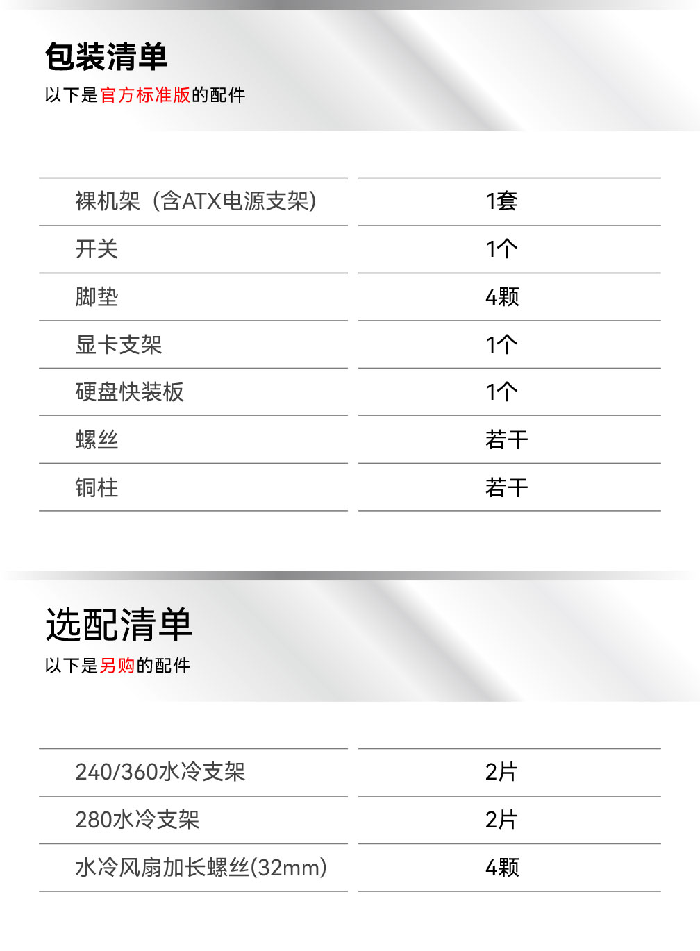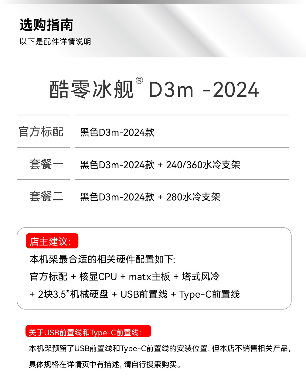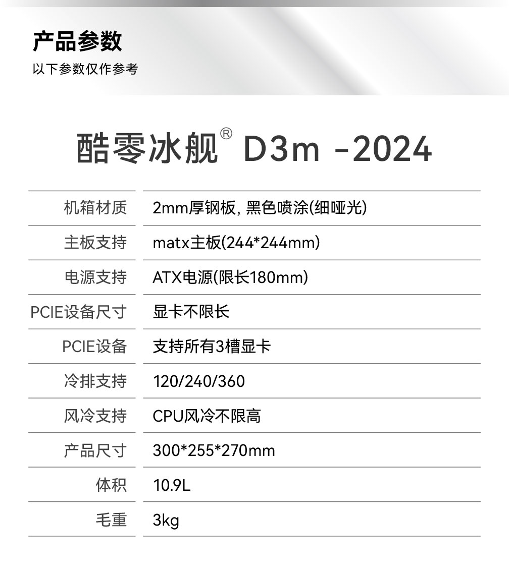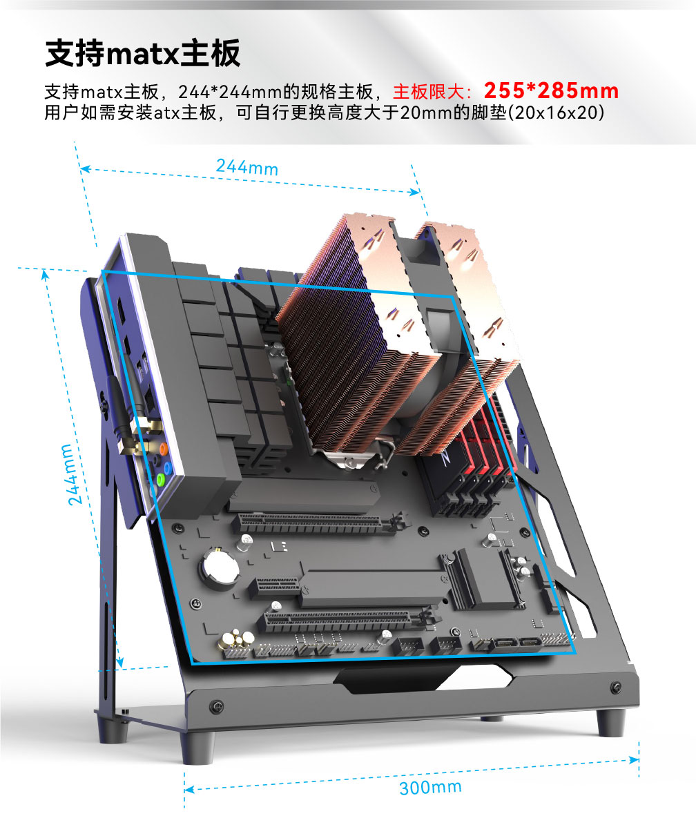 开放式电脑机架 我们对开放式的电脑机箱有执着的热情,这是能设计成功的关键,它的出现可以辅助电脑爱好者挑战电脑硬件的性能极限,因为它能提供更好的散热,更全的硬件兼容性,简易的安装就可以使用。 D3m Iceship X2i是一款开放式的电脑机箱,可自由伸缩来适配GPU的长度,并且支持360水冷的安装,是款不错的小体积itx机架。 价格 ¥: 淘宝零售价 /元 0 淘宝直通链接 结构说明 详细数据 商品介绍 安装教程 2025款D3m架构更新如下: 1.支持ATX主板,机架整体加高10mm。 2.可以安装2个显卡支架,除显卡之外,再安装1个pcie设备。 3.新增显卡挂钩,正确的安装可使显卡因重力下垂变形更小,最大程度保护显卡。 4.显卡挂钩支持高度172mm,厚度78mm以内的显卡。 5.当显卡插入主板的第2个pcie插槽时,挂钩需安装在下面的安装孔。 6.显卡挂钩支持长度大于260mm的显卡,如果显卡短于260mm,将无法使挂钩勾住显卡。 7.显卡挂钩为中空结构,显卡供电线可以隐藏在中间,并设计了扎带的捆绑孔和显卡供电线的出口。 安装视频教程2024.12.16更新